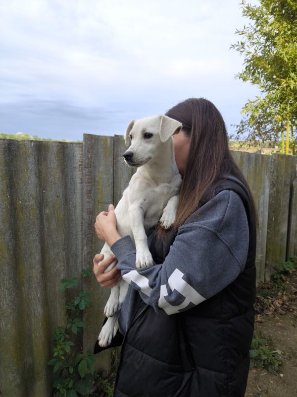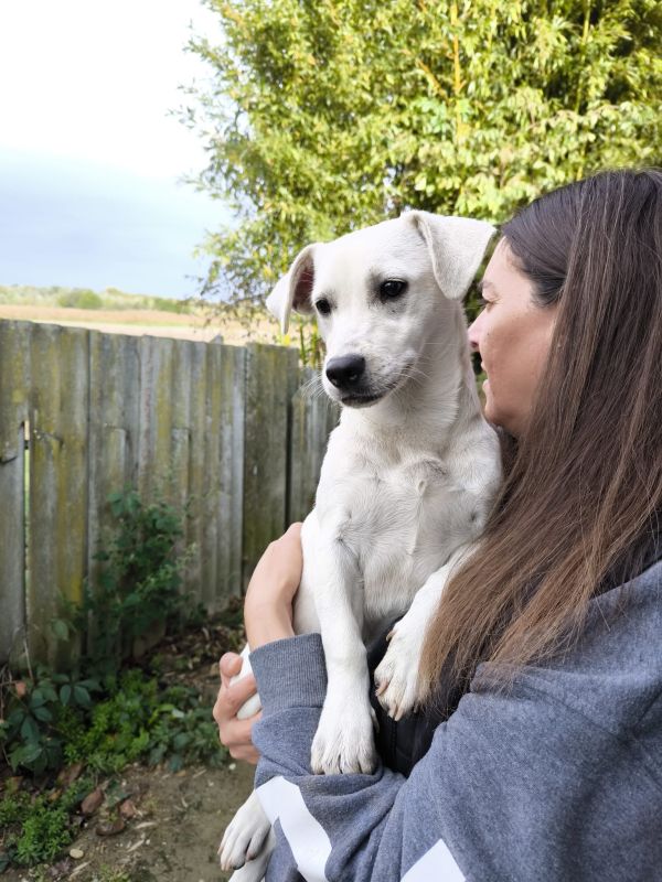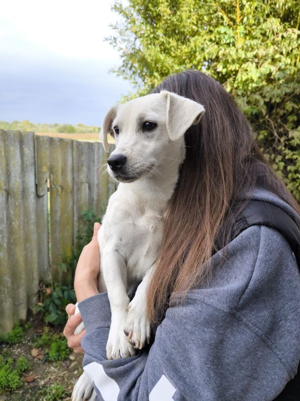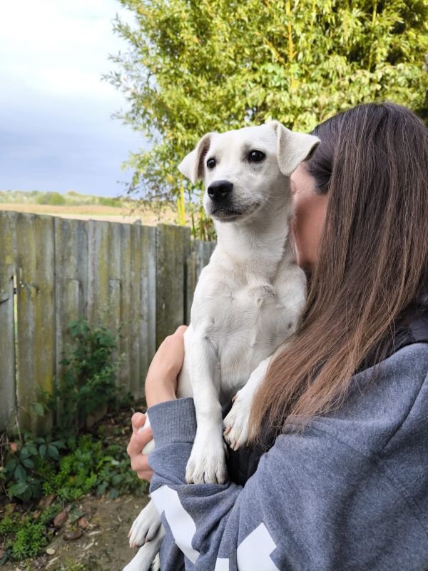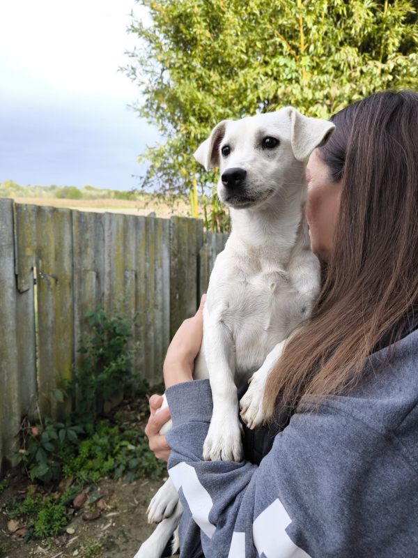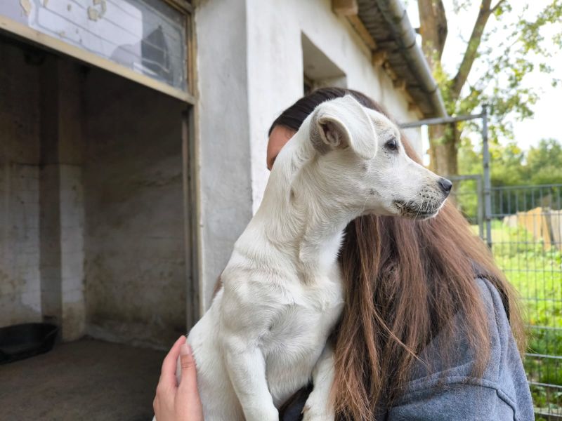 Die kleine Luna, geboren im März 2025, ist aktuell ca. 30 cm groß (und wird ggf. noch etwas wachsen). Sie stammt von einem Bauernhof und wurde Tierheim abgegeben, weil sie die Enkel angesprungen hat – doch das war nichts anderes als ganz normales Welpenverhalten.